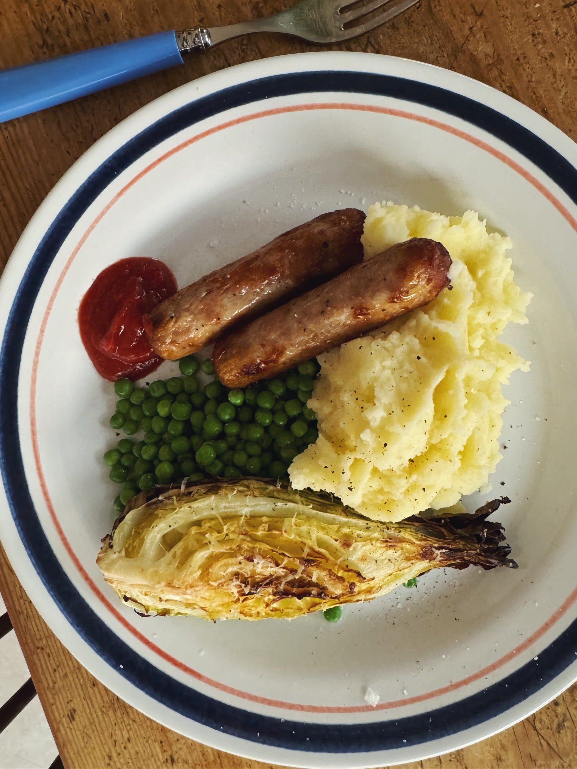 Sausages and Mash with Roasted Cabbage and Peas: I had plans to make sausages and lentils, but then we had lentils for lunch, so I pivoted. I cooked some sausages and pre-heated a sheet pan (slicked with a little olive oil) in the oven for a minute or two before adding the cabbage wedges. Once they got nice and browned (about 10 minutes) I turned them over, cooked for a further 5 minutes, and grated some parmesan over to finish. Served with mash and peas.